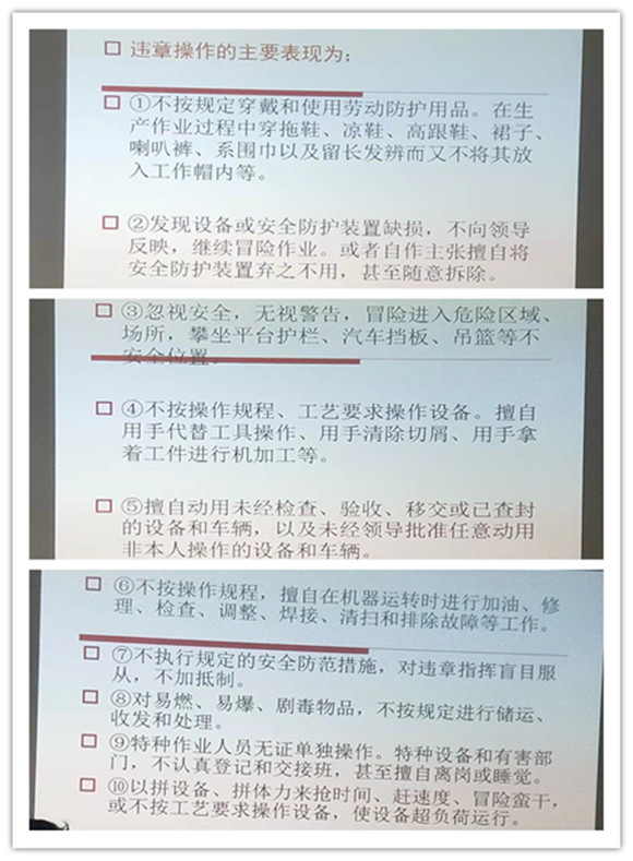 安全生產是企業發(fā)展的根本,提升安全意識則是員工操作的基礎條件(jiàn)。因此馮老師還列舉了一些違章操作的具(jù)體表現,為(wéi)我(wǒ)們(men)闡述(shù)了這些違章操作會產生的安(ān)全隱患和導(dǎo)致的嚴重後果。意在希望各位車間一線員(yuán)工都能增(zēng)強自身的安全意(yì)識、提高警惕、引以為(wéi)戒。